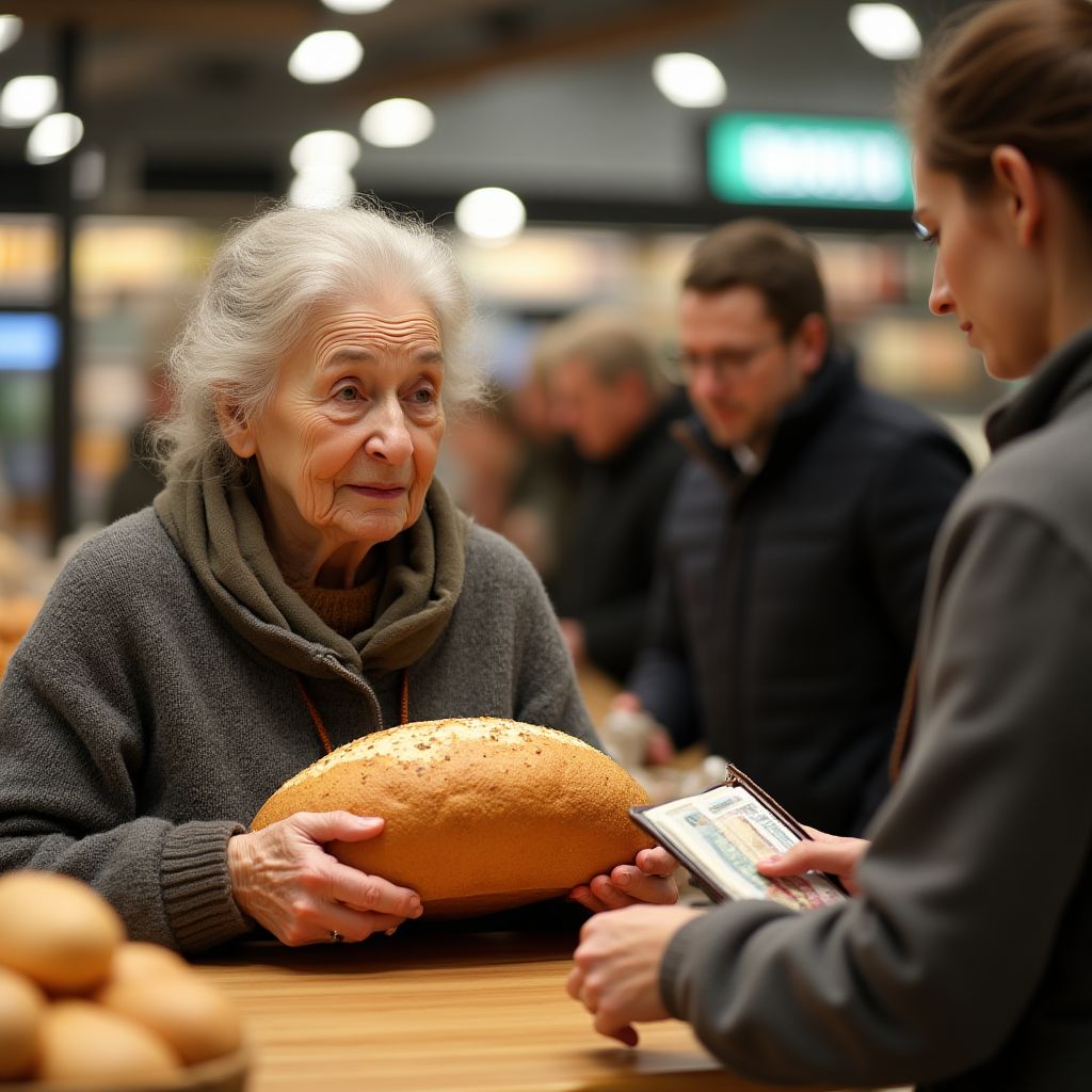 Старушка, та, что держала в руках буханку, дрожала чуть больше обычного; её пальцы сжимали краешек пакетика, ногти короткие и грязные, голос — редкий и слабый. «У меня не хватает…», — сказала она, и это было как скрип старой двери. В её глазах был целый прошлый мир — роддом, долгие очереди в поликлинике, годы одинаковых походов в магазин за крошечной надеждой. Она служила напоминанием о тех, кто выжил, потеряв почти всё: работу, дом, уверенность в том, что завтра будет хлеб.