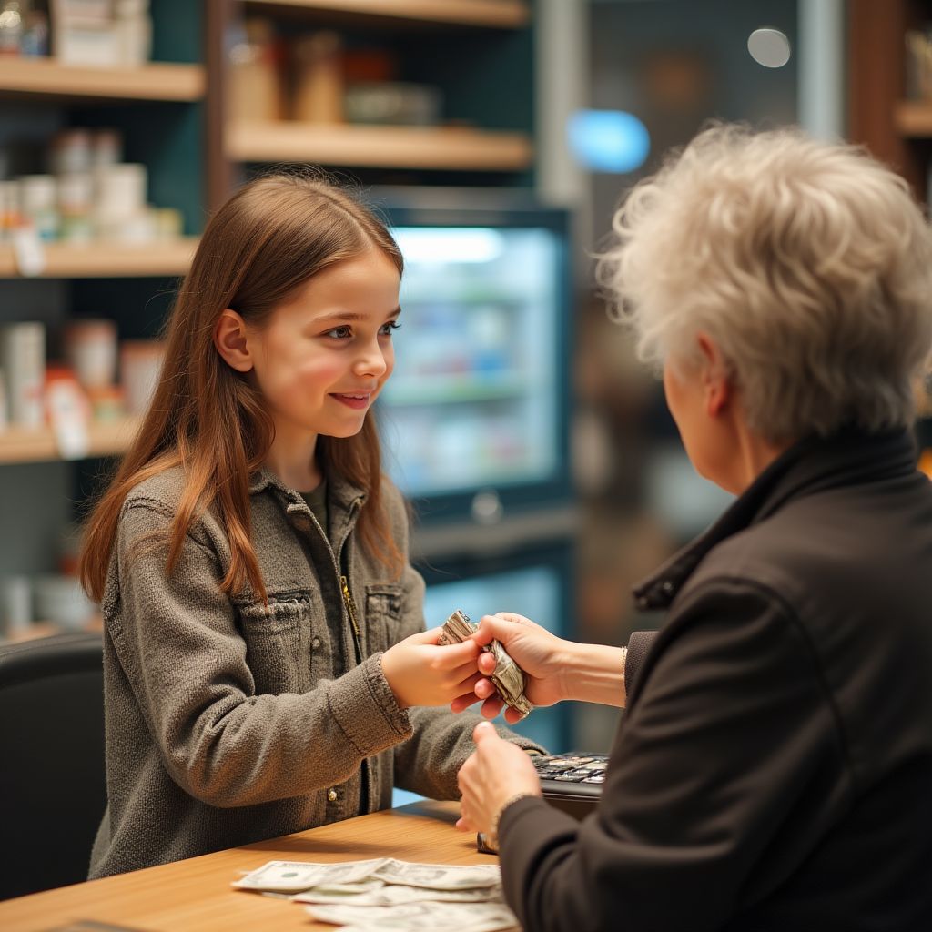 Девочка стояла у прилавка в слишком большом свитере, волосы собраны в неряшливый хвост, глаза большие и тёмные, словно два зеркала, в которых отражалась вся улица. Её руки были чистыми, но ладони шершавые от монет, которые она копила в банке с наклейкой «На лекарство маме». Рост едва до пояса кассира, голос тонкий, как хрустальная нитка. Осанка — слегка сгорбленная, привычка держаться так, будто её вес — чужая ответственность; на коленях — карманная тетрадь с выверенной аккуратностью экономии. Люди вокруг — в пуховиках, деловых пальто, с сумками — двигались уверенно: контраст между её детской скромностью и взрослой торопливостью был как щёлкнутый снимок.