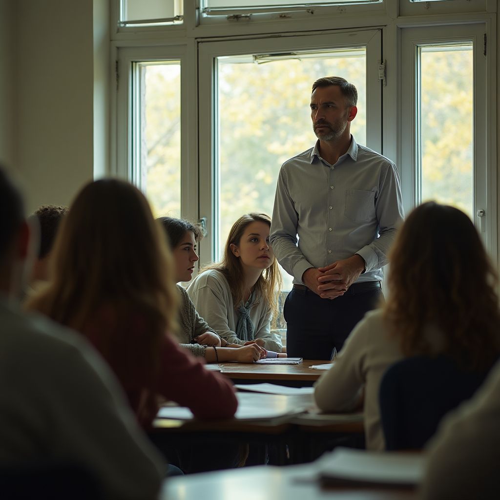 В дверь вошёл он — учитель, которого все называли просто Саша: высокий, чуть сутулый, с глазами стального цвета и срезанными годами морщинами у уголков. На нём был поношенный пиджак, который явно был дороже для него символом безопасности, чем одеждой; рубашка слегка мялась, галстук развязан, волосы ещё влажные от дождя. Его шаги были размеренные, но руки нервно терли обложку тетради. Молодые ребята видели в нём авторитет, старшеклассники — только ещё одного взрослого, усталого и молчаливого.