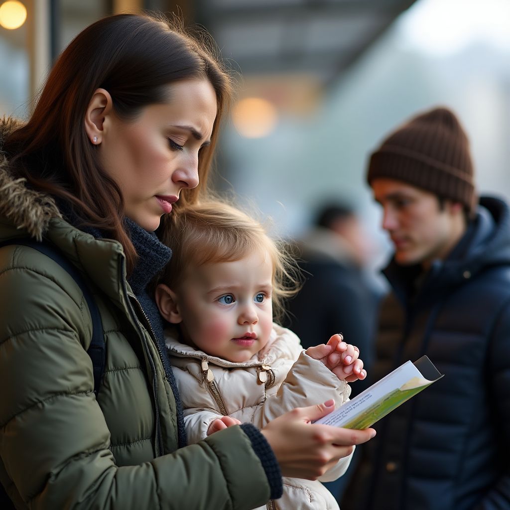 На остановке стояла молчаливая женщина, крепко прижимая к себе маленького ребёнка. Её стройная фигура была закутана в тёмное пальто, из которого выглядывали замерзшие пальцы в потрёпанных перчатках. Бледное лицо с усталыми глазами словно отражало всю тяжесть прошедших дней. Её волосы, тусклые и редкие, свободно спадали на плечи, а взгляд был направлен куда-то вдаль, будто пытаясь увидеть спасение во мраке наступающей ночи.
