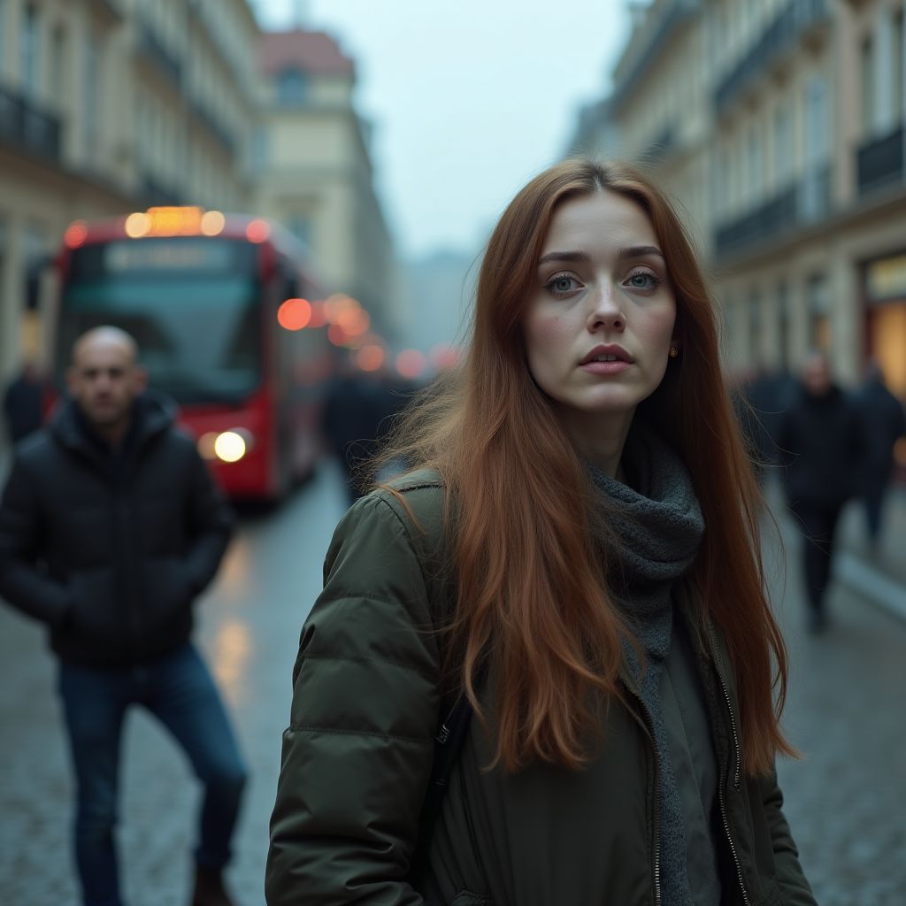 Женщина в грязно-зелёной куртке стояла у края тротуара, водя взглядом по улицам и мокрому асфальту. В её мрачных глазах читалась усталость всей жизни, а растрёпанные тёмные волосы цеплялись за лицо, словно отражая внутренний хаос. Ростом она была чуть ниже среднего, с лёгкой сутулостью, свидетельствующей о годах напряжённых трудов и невысказанных тревог. На ногах старые кеды, потрёпанные и прорезиненные под дождь, а в руках сжимала изорванную сумку с остатками продуктов — её повседневный образ борющейся бедности.
