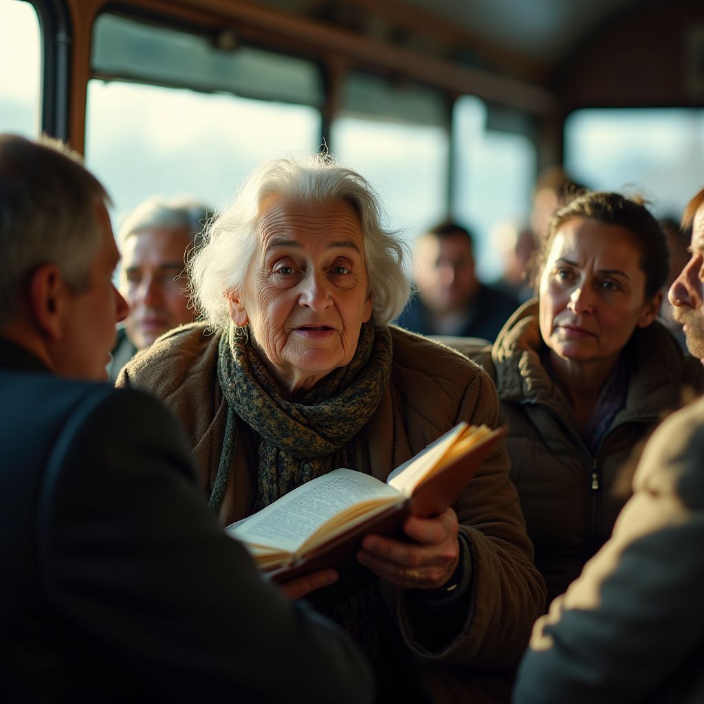 Она глядит на пассажиров, которые заняты своими делами: школьник с портфелем, молодая мать с коляской, бездомный мужчина с натруженными руками. В её взгляде — смесь тревоги и решимости, переплетённые с глубоким воспоминанием. Сегодняшняя поездка для неё — больше, чем просто путь домой. Это — возможность рассказать историю, которую она хранила десятилетиями, и, возможно, изменить жизни тех, кто вокруг.