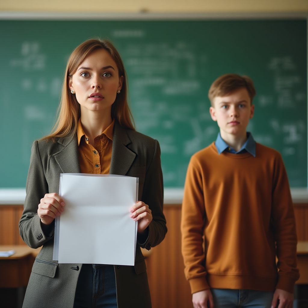 Анна Сергеевна, учительница литературы среднего возраста, с усталым взглядом и аккуратно собранными в узел волосами, сидела за своим столом, перебирая тетради. В её строгое и одновременно мягкое лицо вплетались тонкие линии усталости и заботы. Её скромный, слегка поношенный свитер и простая юбка четко отображали её жизненный статус — однажды выбравшая служить образованию, но оставшаяся далеко от богатства и комфорта. Её легко узнать по спокойной поступи и легкому акценту в речи, который не выдавал прошлого.