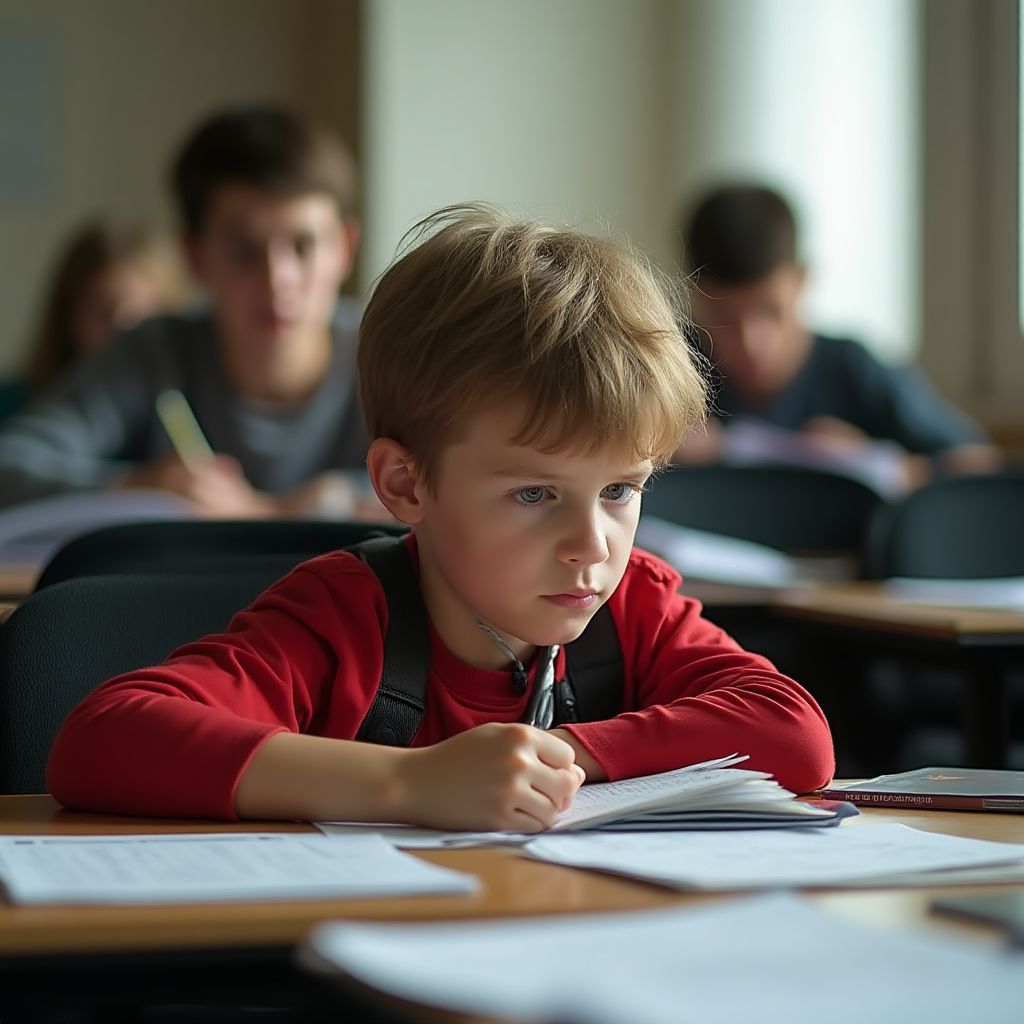 Впереди, у первой парты, сидел мальчик по имени Саша — худенький и аккуратный, с бледным лицом и задумчивыми карими глазами. Его запылённый серый свитер и слишком большие на несколько размеров брюки выдавали простое бедное происхождение. Осанка немного сутулая, руки часто теребили углы тетради, словно пытаясь удержать рассеянное внимание и собрать мысли воедино. Сегодня ему особенно тяжело было сосредоточиться — ему казалось, что весь класс и учитель наблюдают за ним, ожидая чего-то важного.