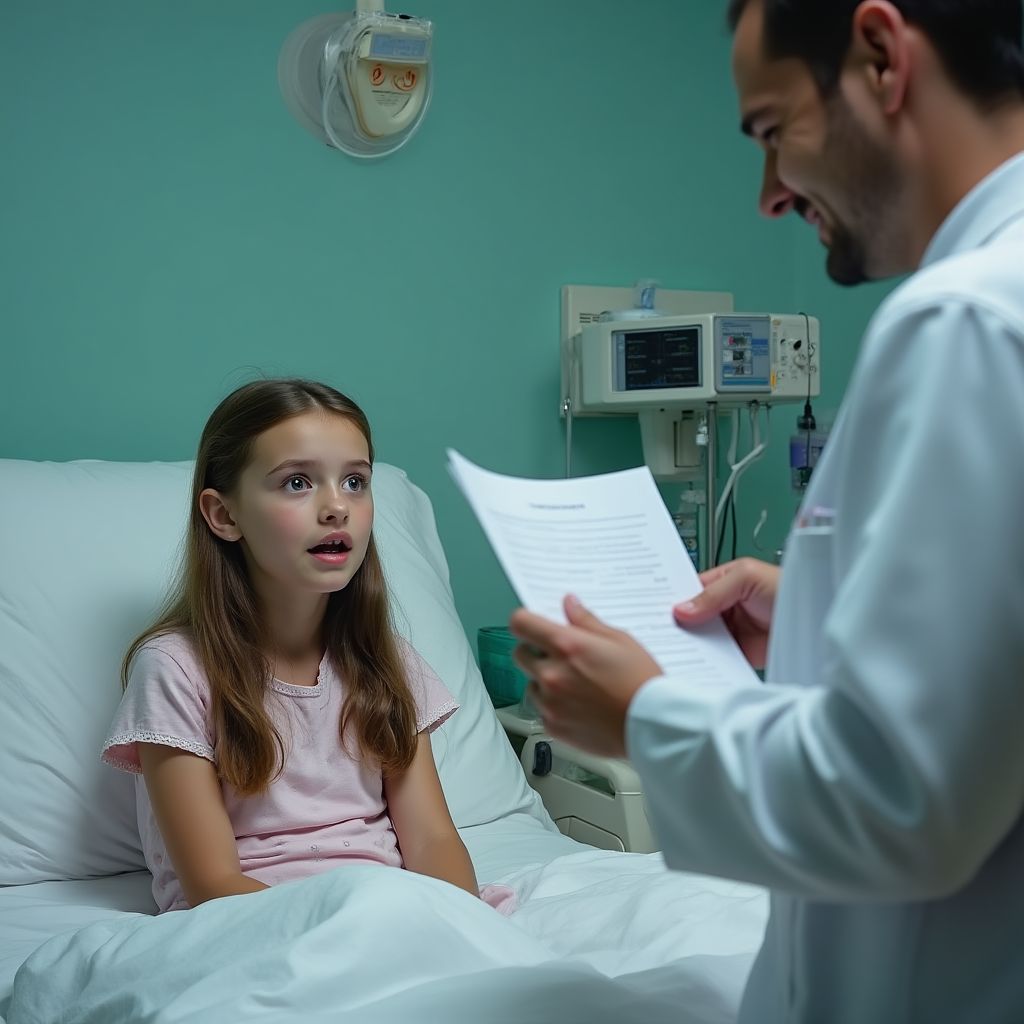 Рядом стояла медсестра, смотревшая на девочку с беспокойством и лёгким сожалением. В палате поселилась тревожная тишина, только часы на стене тихо тикали, словно отсчитывая последние мгновения спокойствия.