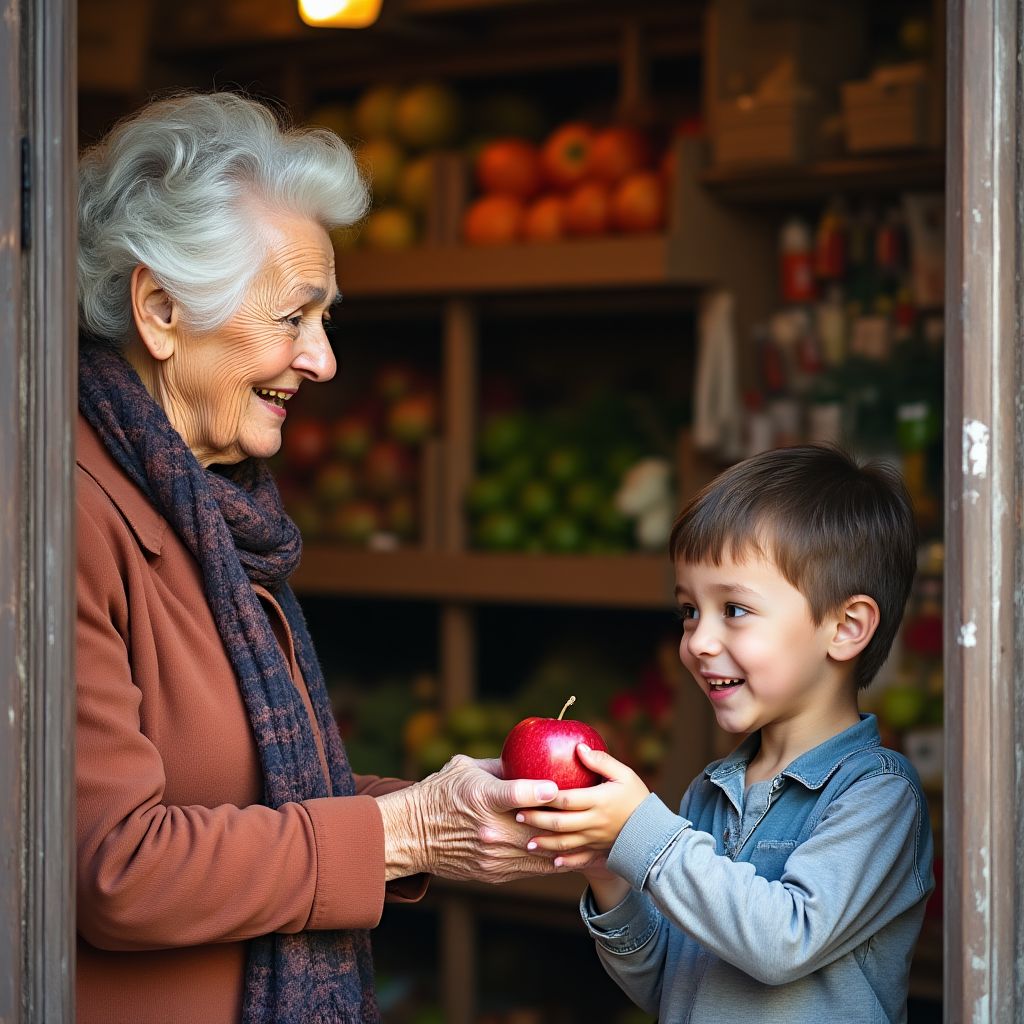 Рядом с ним на улице появилась старая женщина — невысокая, со сгорбленной спиной и глубокими морщинами на лиц…“Яблоко возьмёшь, мальчик?” — тихо спросила она, протягивая поздний плод из потерянного ведра. Его кожа казалась прозрачной под осенним светом, а запах был терпким, резким, непривычным. Мальчик принял яблоко, но в этот момент услышал глухой звонок тележки и шелест голосов проходящих мимо прохожих. Он улыбнулся старице, в глазах мелькнула благодарность, хотя сердце ёкнуло от секретного чувства тревоги.