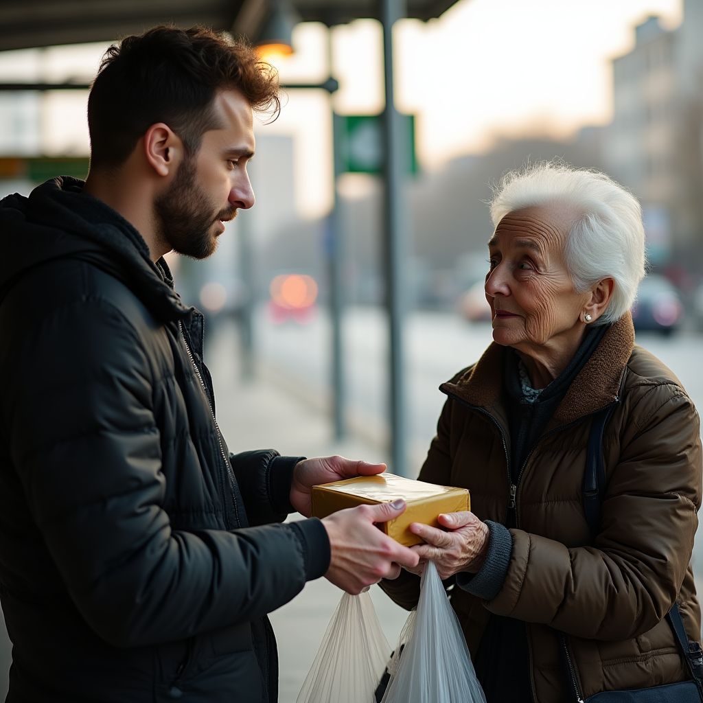Вдруг к остановке подошла старушка, вся в оборванных, грязных одеждах, с опущенной головой и усталыми глазами. Она едва держалась на ногах, а ее руки дрожали от холода и голода. Мужчина тихо поздоровался с ней, пытаясь скрыть свою тревогу. «Вы не хотите немного помочь?» — спросил он, протягивая ей пакет. Старушка отшатнулась, в её глазах вспыхнуло недоверие: «Зачем он мне? Никому я не нужна…»