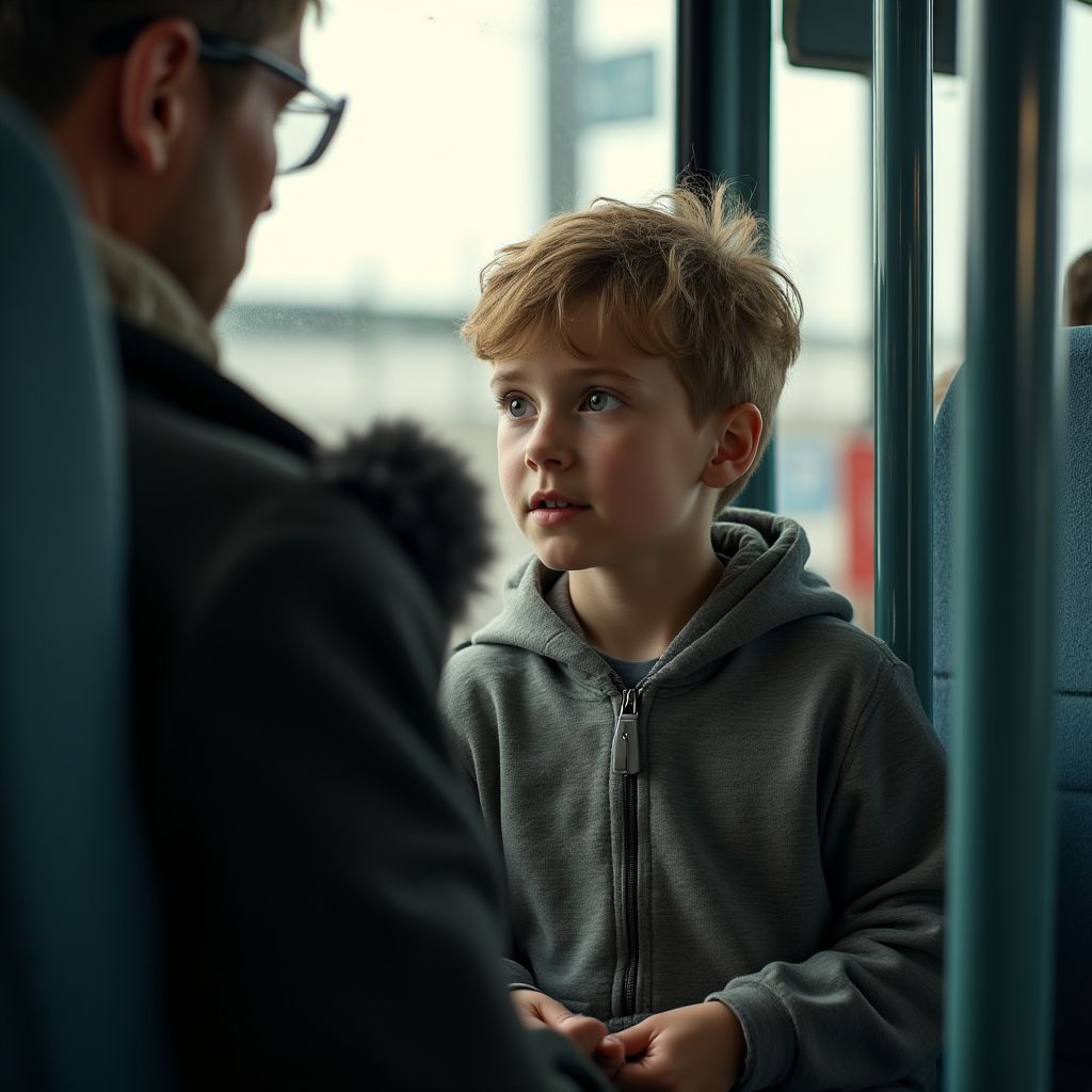 Он вбежал — мальчик лет двенадцати, с мокрой от дождя головой и рюкзаком, висящим на одном плече. Глаза большие, тёмные, с проседью страха; на лице — отметины и следы детской усталости. Куртка сшита не по размеру, затертые джинсы и старые кеды выдавали бедность, но в походке было что-то настойчивое, как у тех, кто привык просить и ждать ответа. Он задыхался, борясь с волнением, и казалось, что воздух в автобусе стал плотнее, когда он прошмыгнул мимо сидений и встал у прохода, осторожно прижимая к груди бумажник пустыми руками.