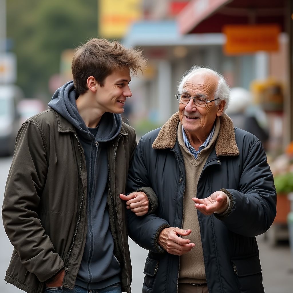 Они шли по мостовой, свет от витрин отбрасывал длиные тени, а на автобусной остановке люди смотрели с разной степенью интереса: кто‑то шёптал, кто‑то отвернулся. «Что это за мужчина?» — слышал он позади. «Видно — добрый», — ответил кто‑то. «Или наивный», — добавил третий голос. «Сколько у нас таких, что делают вид, что не замечают?» — тихо спросил ребенок, глядя на старика с любопытством. Сердце его било так сильно, что казалось — его слышат все вокруг, и всё готовилось к одному движению, которое изменит всё.