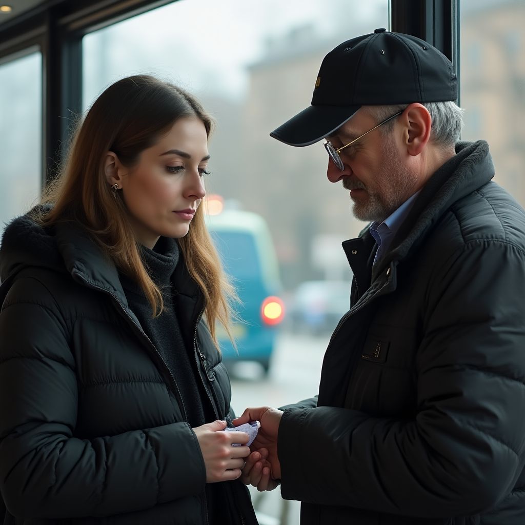 Водитель, взяв билет из её рук, медленно поднял взгляд на девушку. Его лицо выражало смесь шока и растерянности. Сердце в его груди забилось сильнее, дыхание перехватило, словно он стоял перед неизвестной гранью, которую никто не ожидал пересечь. Окружающие — водители, пассажиры и случайные прохожие — замерли в напряжённом ожидании, когда он осторожно произнёс: