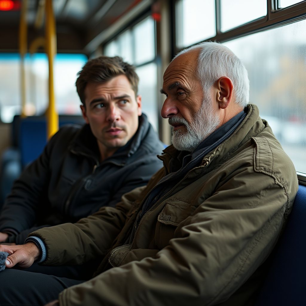 «Погодите, — неожиданно вмешался пассажир через ряд, — вы так уверены в своей истории? Может быть, просто хотите жалость вызвать?» — голос был скептическим, но внутри чувствовалась неуверенность. Бездомный усмехнулся горько и кивнул: «Многие думали так же, пока не узнали всю правду.» Вокруг повисла тишина, она казалась тяжелой и давящей, будто весь автобус погрузился в атмосферу невысказанного ожидания.
