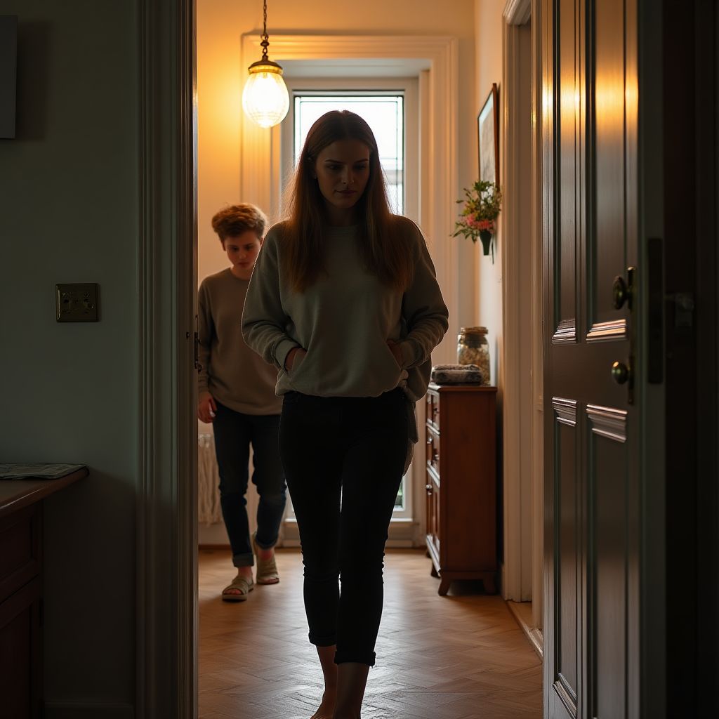 Внезапно раздался детский голос из комнаты: «Мама, ты останешься?». Она охватила дрожь, спустила глаза на записку в руке: «Прости, я должна уйти, чтобы всё изменилось.» Пауза. — «Мы заслужили лучшей жизни. Ты поверишь, когда я вернусь.» Когда она тихо вышла, оставив дверь приоткрытой, воздух наполнился напряжением.