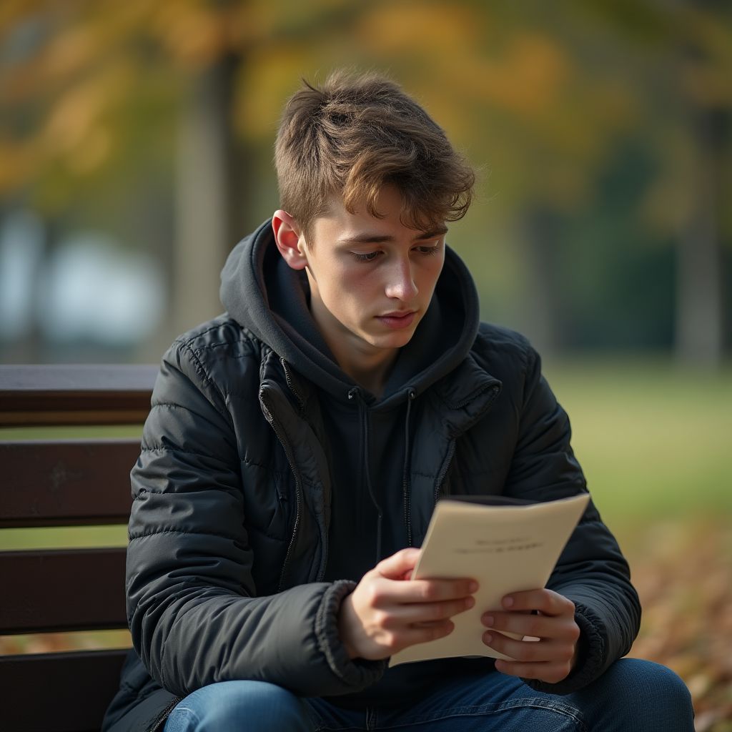 На этой самой скамейке едва различимо сидел молодой парень, одетый в поношенную куртку и джинсы, с опущенной головой, словно пытаясь увести мысли подальше от мрачных улиц родного района. Его глаза были глубокие и тёмные, отражающие усталость и разочарование. Высокий, но слегка сутулый, он казался чужим в этом блестящем мире витрин и ярких огней. Руки, покрытые мелкими царапинами, нервно перетирали старую кожаную сумку, из которой небрежно выглядывал уголок сложенного письма.