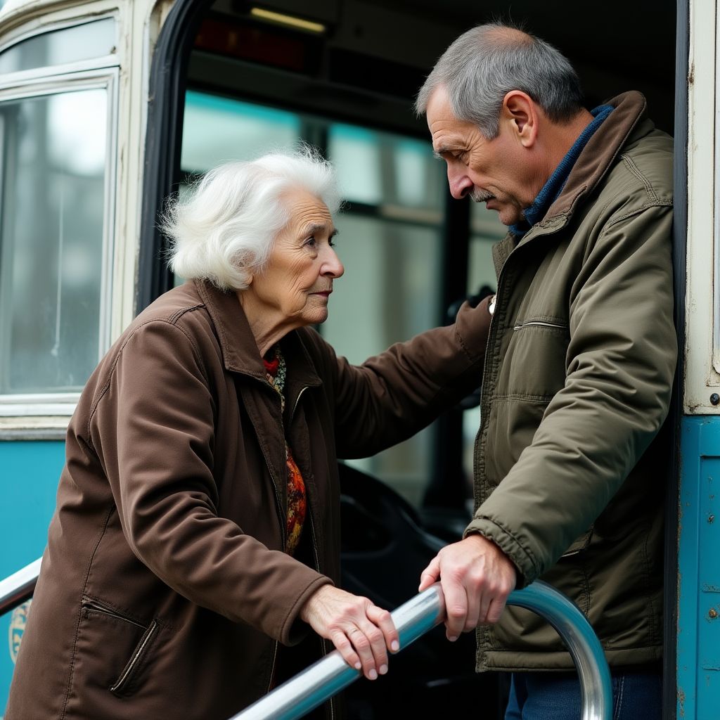 На ступеньках старого городского автобуса стояла хрупкая пожилая женщина. Её серая куртка была выгоревшей и местами потертой, на руках — иссохшие пальцы, а глубоко посаженные глаза смотрели с усталостью и надеждой. Маленький платок туго обвивал голову, пряча седые волосы, а в лицо вкрадывался след тяжелых лет – морщины, словно дорожки забытого пути. Она попыталась взобраться на ступеньку, но трясущиеся ноги не захотели подчиняться, а дыхание сделалось прерывистым. Каждое движение давалось с большим напряжением.
