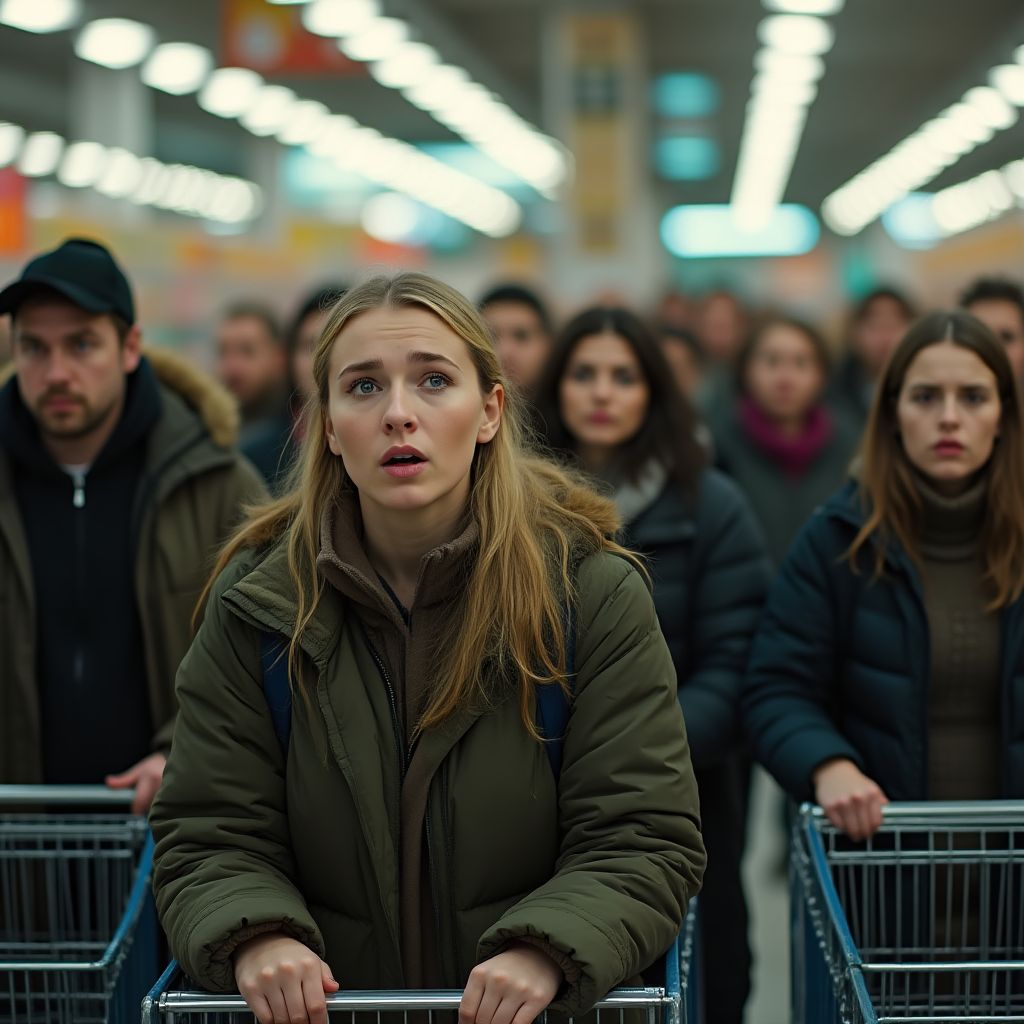 В толпе выделялась она — женщина средних лет с пронзительными зелёными глазами и огромной сумкой через плечо. Её одежда была неровной и немного смахивала на старую — потертые джинсы и поношенный серо-бежевый плащ, от которого веяло усталостью и постоянной борьбой. Взгляд её метался по лицам других покупателей, словно пытаясь найти что-то в их глазах. Рост около полутора шестидесяти, с лёгкой сутулостью, которая казалась следствием долгих лет тяжелой жизни, но в движениях чувствовалась скрытая сила и решимость. Её руки, слегка дрожащие, безупречно контрастировали с твёрдостью в голосе, когда она тихо всхлипывала раздражённой толпе.