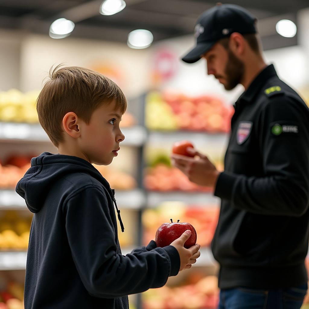 Вдруг к мальчику подошёл охранник магазина — высокий мужчина с суровым взглядом и крепкой фигурой в форме. «Эй, постой! Ты хочешь заплатить за это яблоко?» — спросил он, глядя пристально вниз на ребёнка. Мальчик молча покачал головой, нервно сжимая фрукт. «Ты знаешь, это краденное, — продолжил охранник строго, — так поступают не все, знаешь?» — сказал мужчина, а по магазинам начали проходить взгляды других покупателей. Их лица менялись — от недоумения до осуждения. Некоторые шептались между собой: «Опять эти уличные дети…» — прозвучало резко из толпы.