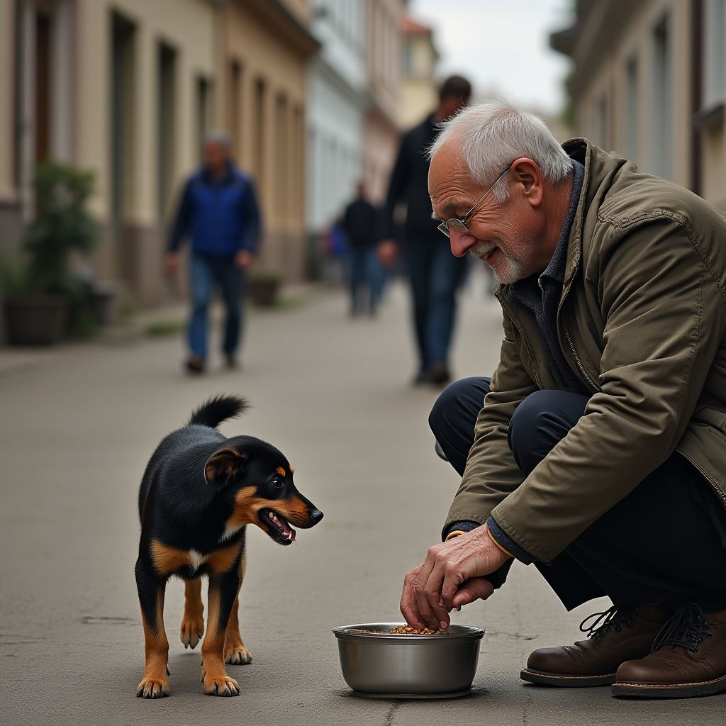 Пётр Иванович, невысокий и худощавый мужчина в поношенном плаще с глубокими морщинами на лице, медленно проходил по тротуару, придерживая в руках миску с остатками вчерашнего борща. Его тусклые глаза, горевшие тихой добротой, перебегали с одной сгорбленной собаки на другую. Ветер застилал пробивающиеся сквозь редкие волосы пряди седины на висках, а руки старика слегка дрожали от холода и возраста. На шее висел простой деревянный крестик, едва заметный под ворохом изношенной шерсти пальто. Его вздох был глубок и тёплый, несмотря на холод вокруг. Ежевечерний ритуал — приносить еду бездомным собакам на старом рынке — для Петра был не просто привычкой, а тихой борьбой за то тепло, которого многим здесь не хватало.