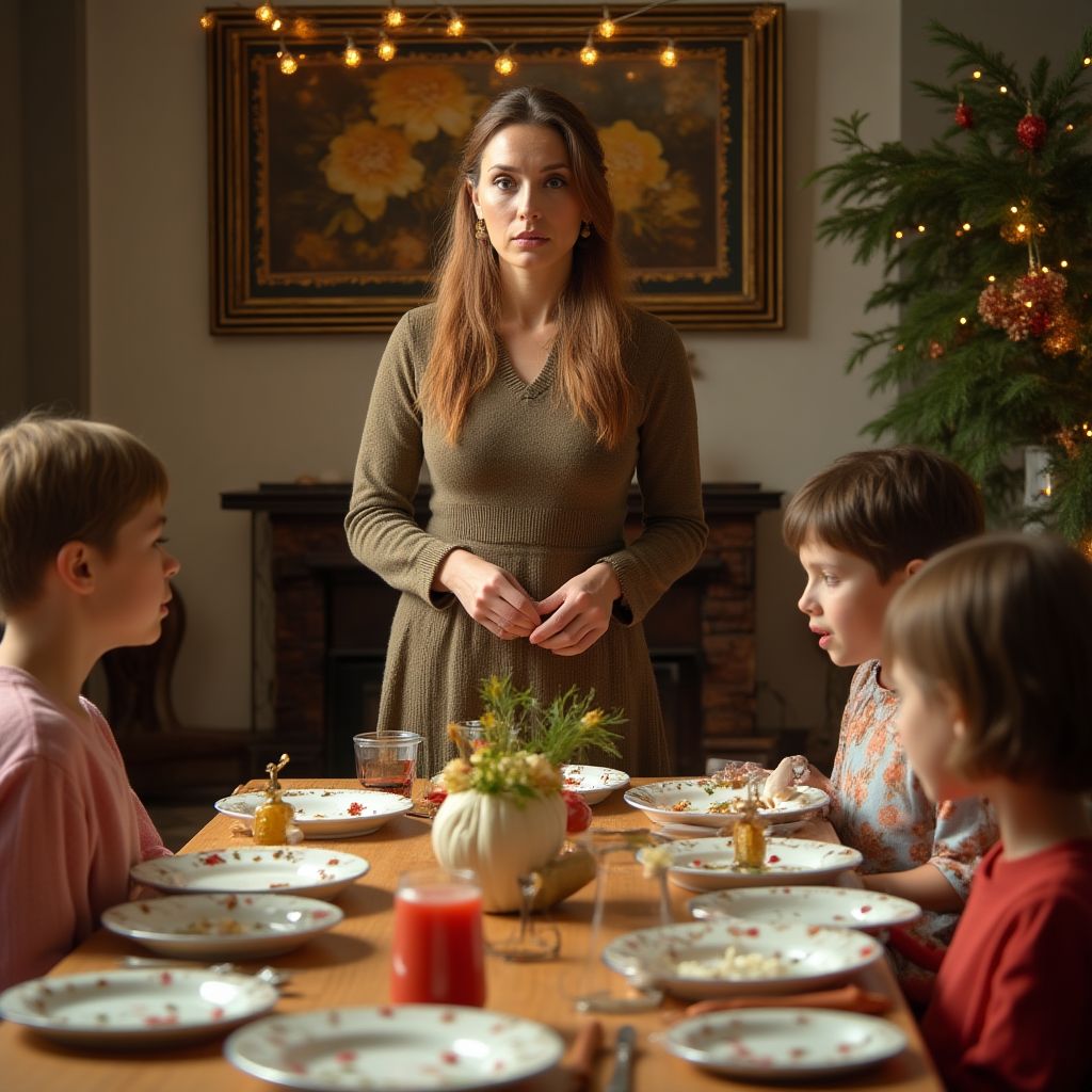 Аня, худенькая женщина с усталым взглядом и седыми висками, аккуратно раскладывала блюда на столе. Её простая кофточка и потёртые джинсы говорили о жизни, полной труда и лишений. Она переминалась с ноги на ногу, руки слегка дрожали от волнения. Несмотря на скромность жилья и небольшой достаток, её глаза светились любовью к семье и тайной надеждой. Её тихие движения и задумчивое лицо словно говорили о том, что эта ночь будет отличаться от других.