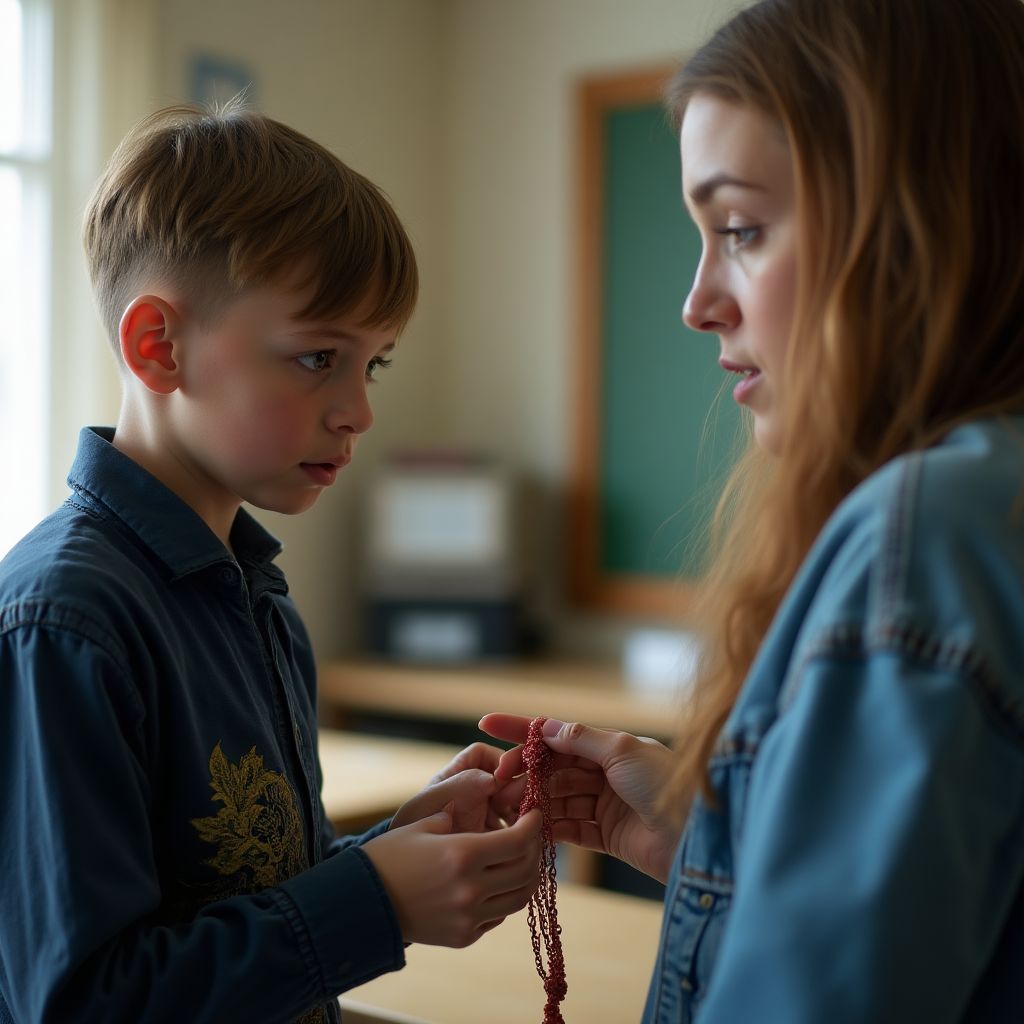 Когда дверь класса тихо открылась, учительница Анна Ивановна, женщина с усталыми, но добрыми глазами и аккуратной прической, посмотрела на мальчика. «Антон, ты пришёл? Что-то случилось?» — спросила она тихо. «Я нашёл этот браслет на вокзале, — начал он, слегка запинаясь, — и он принадлежал кому-то очень важному для меня. Мне нужно рассказать историю…» — его голос дрожал, словно дрожь от холода пробирала через каждую клеточку. «Что это за история?» — тихо спросила она, чувствуя нечто большее, чем просто потерянный аксессуар.