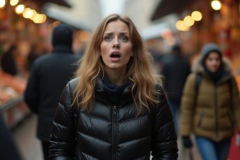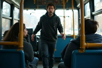 Осенний вечер опустился на шумный городской рынок, где старый автобус медленно остановился на остановке.