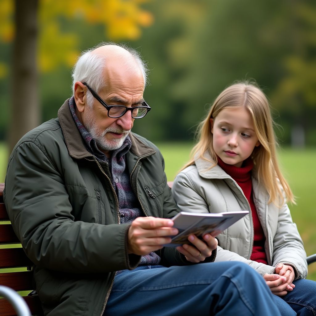 Он появился внезапно, седой пожилой мужчина ростом чуть ниже среднего, худой, с изношенной кожаной курткой, висящей на хрупких плечах. Его руки были замерзшими, пальцы дрожали, словно листва на ветру, лицо — изрезанное мелкими морщинами, окружающими глубокие, блестящие от жизненных бурь глаза цвета зимней старины. Неуверенная осанка и медленные, будто от усталости, движения выдавали годы тяжёлой работы и нескончаемых лишений. Рядом с ним на скамейке лежала простая тряпичная сумка, едва держащая форму. Его голос, когда он заговорил, был тихим и хриплым, словно шёпот ветра между сухих ветвей. Он казался частью этой серой улицы, и вместе с тем — словно носитель давно забытой истории, спрятанной под толщей времени.