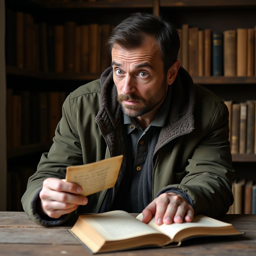 В центре всей этой сумятицы находился Александр — мужчина средних лет с усталым взглядом глубоких зелёных глаз и волосами, потемневшими от времени и забот. Его одежда была скромной: простая тёмная куртка, поношенные джинсы и изношенные ботинки, выдававшие привычку долгих ходьб. Осанка слегка сгорбленная, будто груз прожитых лет давил на плечи. Александр перебирал книги на стеллажах, казалось, он искал что-то особенное, важное для его внутреннего покоя. Его лицо время от времени озарялась лёгкой надеждой, но за этой маской скрывалась глубокая усталость и тревога.