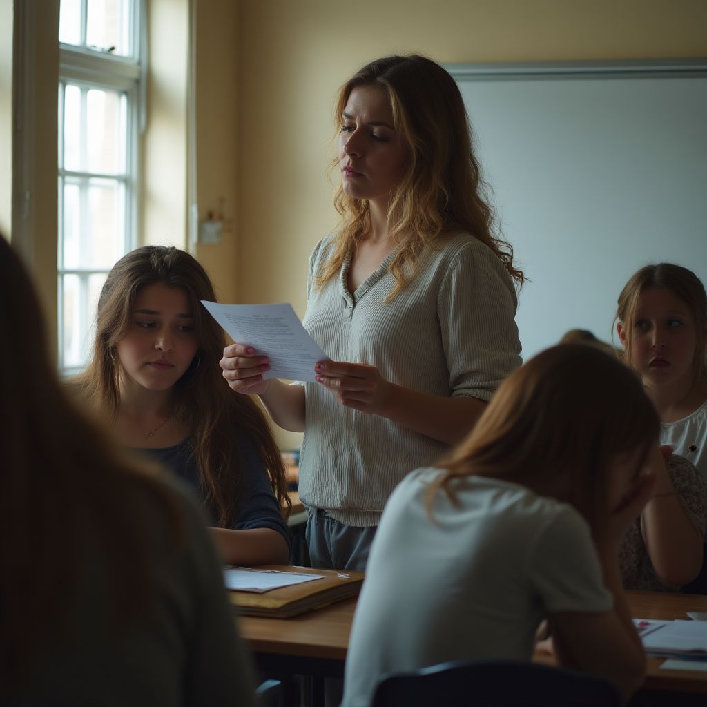 Марина Ивановна, учительница литературы, компактного роста женщина с усталым взглядом и седыми висками, уверенно закрыла массивную дверь класса на ключ. Её глаза — глубокие и пронзительные, словно отражающие весь груз пережитого — задержались на пустых партам, а руки крепко сжимали старое пожелтевшее письмо. В одежде простой, немного поношенной блузе и тёмной юбке она выглядела как представитель обычного рабочего класса — женщина, чей честный труд редко замечали. Ее осанка была напряжённой, а губы сжались в тонкую линию, пытаясь сдержать эмоции.