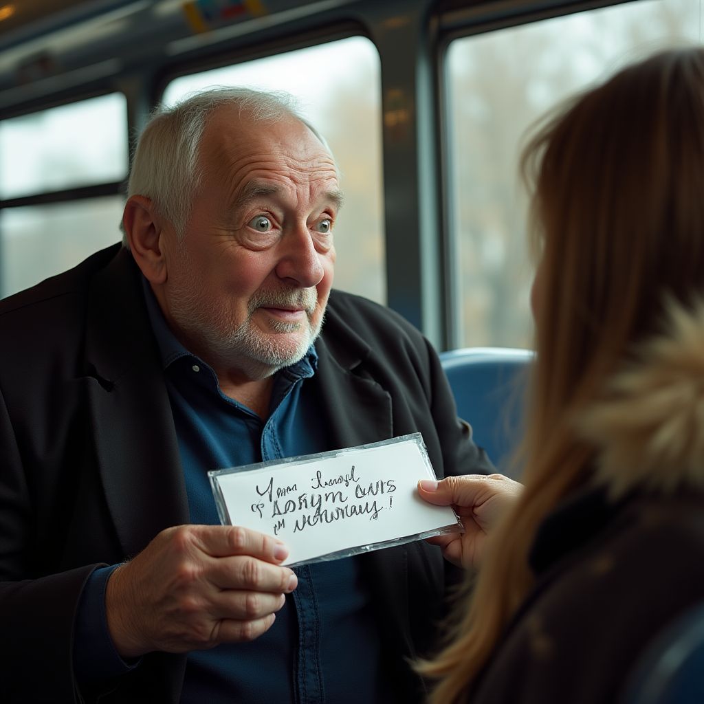 Весь автобус словно замер ожиданием, а старик ощущал холодный пот на лбу. Сердце сжималось, дыхание сбивалось от волнения, руки дрожали — он должен был решить, что делать дальше. «Можно ли доверять этой загадочной незнакомке? Что, если это ловушка? Но разве я вправе оставить это послание без внимания?» — мысли вихрем кружились в голове, но внутри зажёгся огонёк решимости.