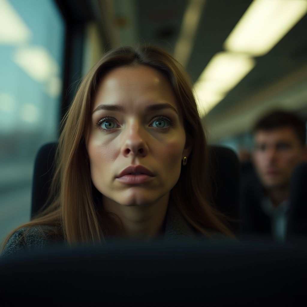 Женщина почувствовала, как воздух вокруг неё будто сгущается, и все звуки меркнут. Спина онемела, а губы сами собой сомкнулись в молчании. Она больше не могла говорить — слова застряли в горле, оставляя лишь холод и боль внутри. Под её взглядом мелькнули образы прошлого — отверженность, унижения, потери. Казалось, что весь вагон слушает их разговор, и ей самой кажется, что тайна её жизни вот-вот всплывёт наружу.