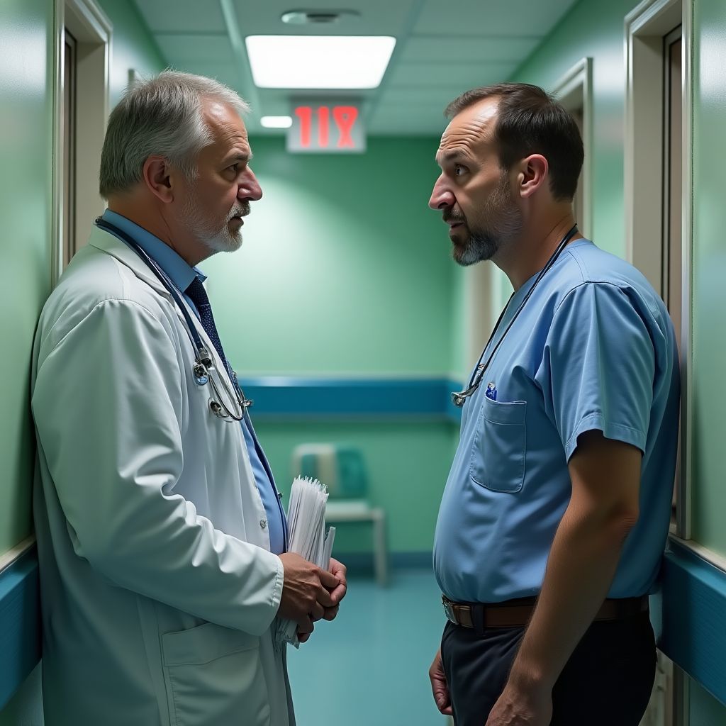 Врач, резко появившись из кабинета, остановился рядом, и его голос прозвучал сурово: «Господин Петров, пройдёмте, нужно поговорить» — сказал он с наигранным спокойствием. Мужчина рабочих, ожидавший новостей о жене, почувствовал, как всё внутри сжалось. «Что-то не так?» — спросил он тихо, глядя своим исподлобья взглядом в глаза доктора. «Я сомневаюсь, что вы понимаете, насколько всё серьёзно», — ответил врач, поворачиваясь к нему. За углом начали раздаваться приглушённые голоса и шёпоты других людей, и воздух стал холоднее. Андрей заметил, как несколько женщин в коридоре переглянулись, их лица были полны страха и недоумения.