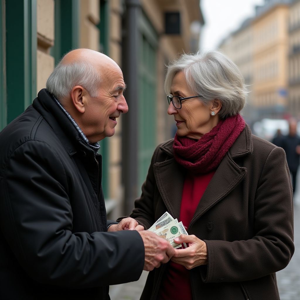 Сердце мужчины забилось с тревогой и страхом, дрожь пробежала по его позвоночнику. Он чувствовал, как тепло исчезает из рук, отдавая последнюю надежду. Вокруг начали собираться люди, заинтересованные в загадочной сцене. Кто-то шёпотом высказывал сомнения, другие переглядывались, а кто-то негодующе фыркал: «Вот старик и отдаёт всё, а она что-то замышляет». Мужчина не мог оторвать взгляда от девушки, в его груди разгоралось противоречие — доверять или нет.