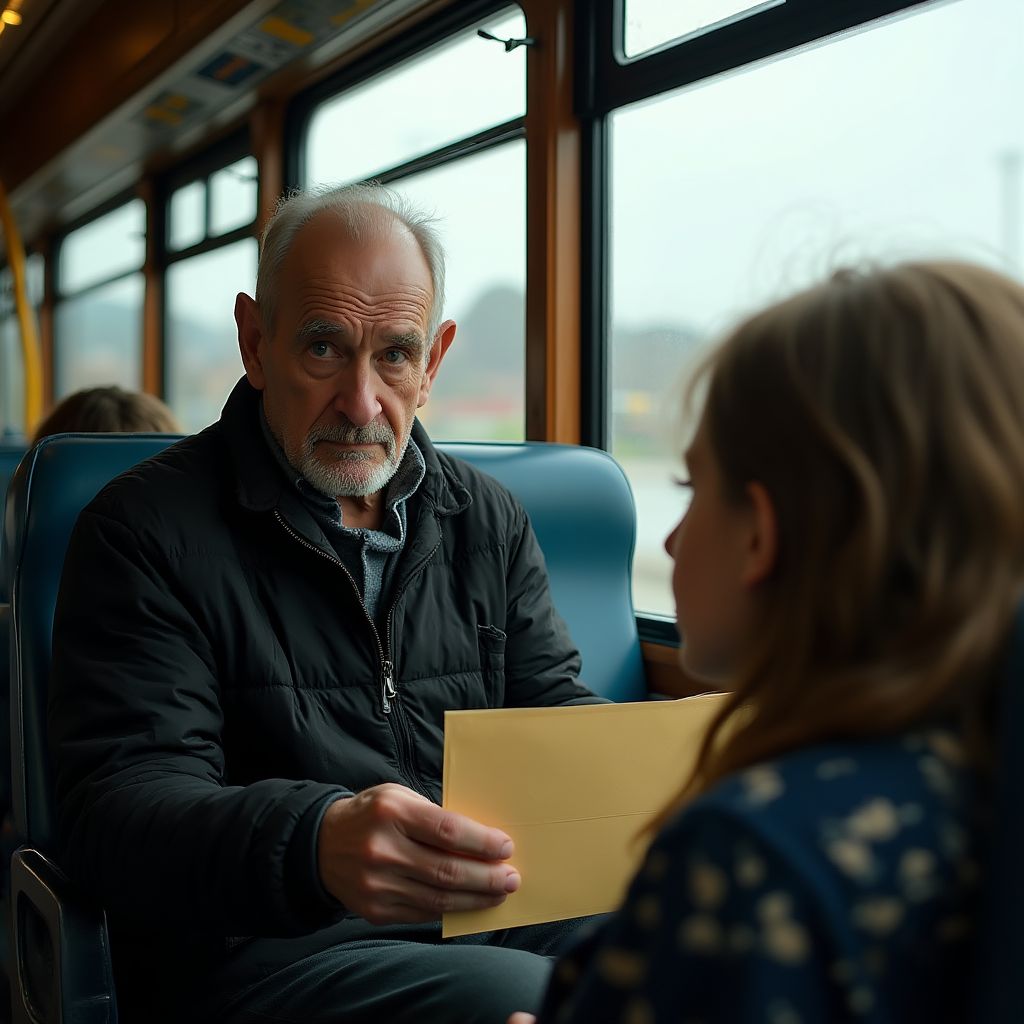 Пассажиры обернулись, охваченные любопытством и страхом. «Что такого скрывает этот конверт?» — прошептал пожилой ветеран, глаза его блестели от неизвестности. «Там вся правда о несправедливости, которую давно забыли,» — ответил старик.