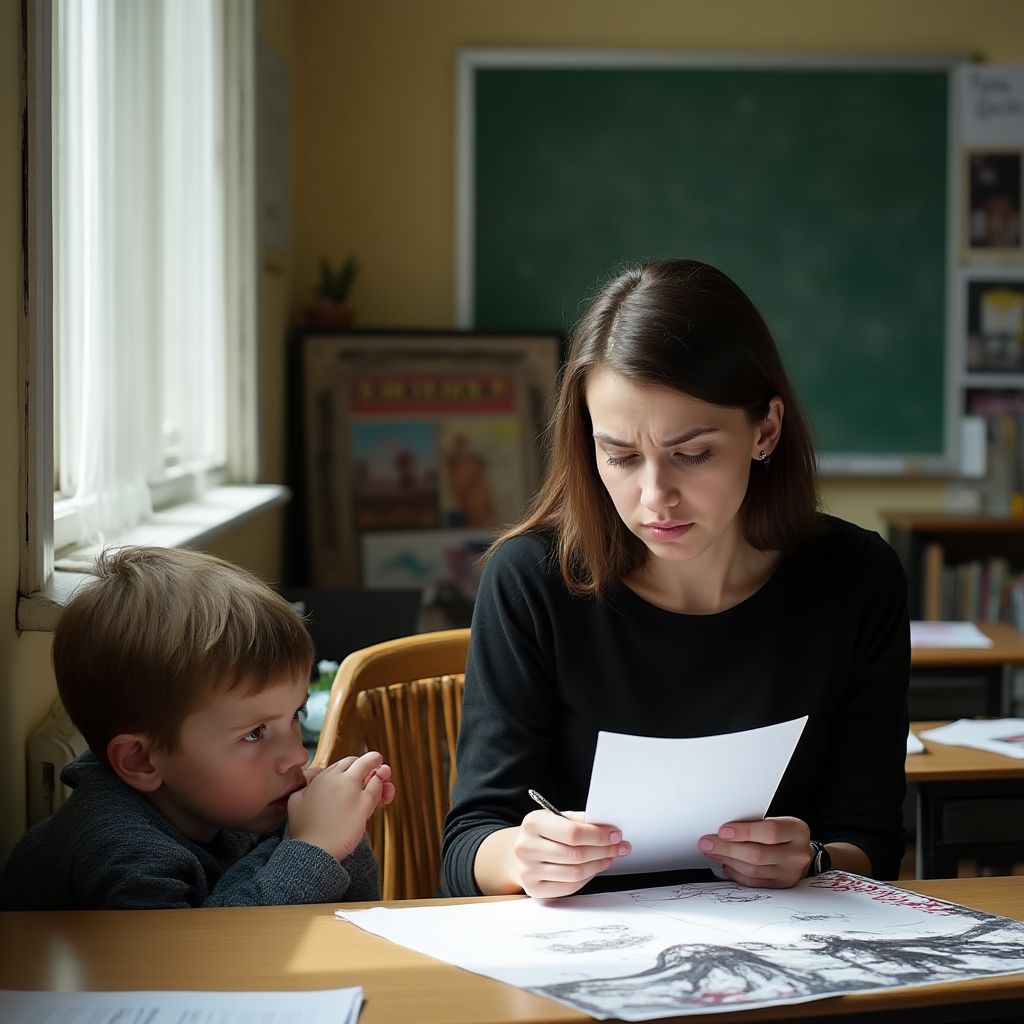 Стены класса дрожали от напряжения, когда Тимофей нерешительно вытащил из тетради исписанный лист. Учительница подошла ближе, её глаза сузились, будто пытаясь увидеть нечто скрытое за простыми линиями краски и карандаша. «Что это?» — спросила она, голос её дрожал, словно предчувствовала беду. «Это…», — мальчик замялся — «это рисунок моей мамы. Но там не просто рисунок — там записано то, что никто не должен знать». Комната наполнилась затаённым дыханием.