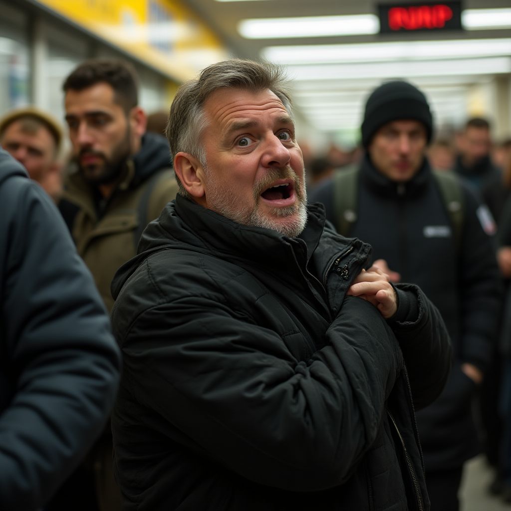 Среди изнурённых лиц выделялся мужчина около пятидесяти лет: высокий, с глубокими морщинами на лбу и усталыми голубыми глазами, устремленными в пустоту. Его одежда — старый потёртый плащ и запылённые ботинки — явно не скрывали ни бедности, ни усталости. Волосы, с проседью на висках, слегка взъерошены, как будто нечаянно потрёпаны ветром. В его позе – сгорбленность и усталость, но взгляд пронзительно острый, полный недосказанности. В руках он держал ветхий паспорт и несколько денежных банкнот, которые казались ему заветным ключом к маленькой мечте. Было видно, что каждое движение давалось ему с трудом – как и само пребывание в этом месте.