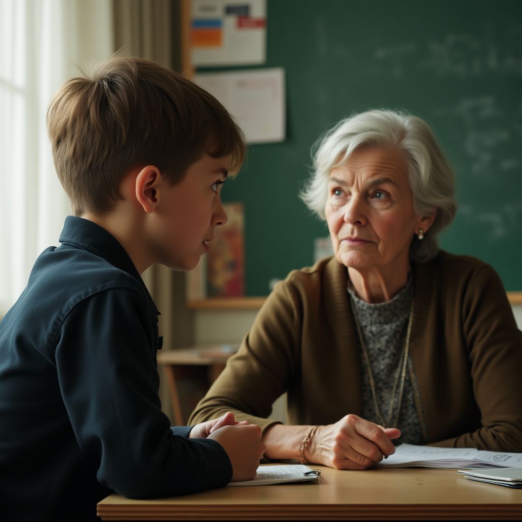 — «Здравствуйте, Мария Сергеевна,» — начал он тихо, глаза избегали взгляда учительницы, — «Я… у меня есть что-то, о чём я должен вам рассказать. Это тайна, которую я хранил много лет.», — слова вырывались с едва заметной дрожью. Учительница, женщина средних лет в простой тёмно-синей кофте и очках на кончике носа, подняла удивлённый взгляд и ответила мягким, но настороженным тоном: — «Что же это за тайна, Ваня? Почему ты так долго молчал?» В комнате повисла тишина, нарушаемая лишь ровным тиканьем часов на стене, и воздух словно сжался, пронизанный ожиданием и невысказанными страхами.