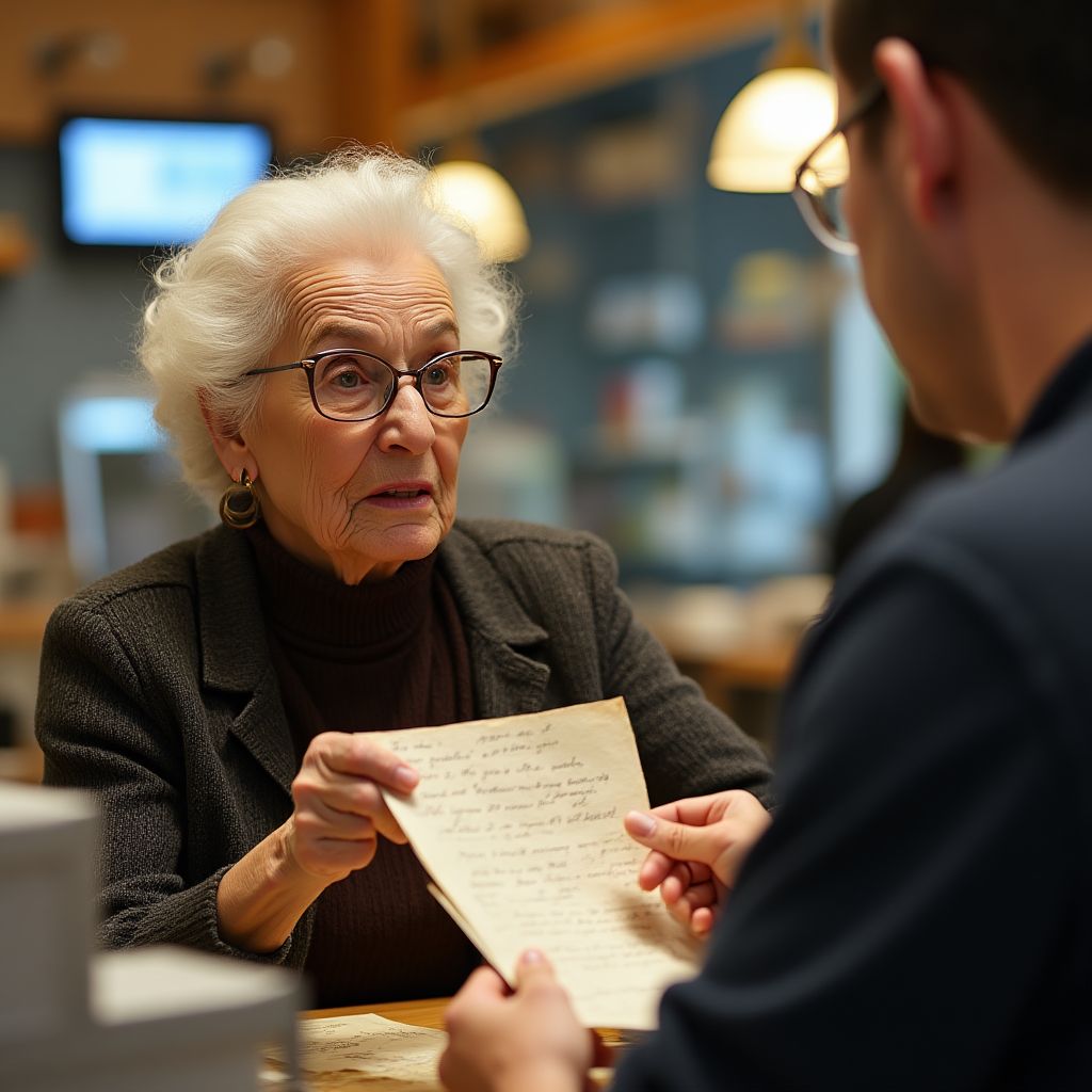 Кассир, молодой парень в поношенной рубашке, листал газету, не обращая внимания на происшествие. В этот момент к женщине подлетел незнакомец — мужчина лет сорока с усталым взглядом и потертым пальто. Его голос прозвучал тихо, но твердо: «Можно я посмотрю, что у вас в руках?». Женщина замерла на месте, взгляд её метнулся между парнем и мужчиной, в воздухе повисло молчание. «Это всего лишь старая бумажка, но она многое значит», — ответила она с лёгкой дрожью в голосе.