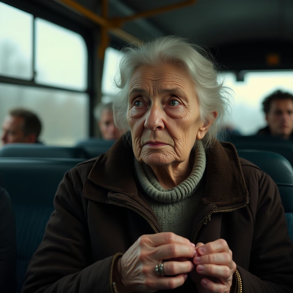 «Почему никто не замечает мою боль?» — думала она, сжимая губы, чтобы не разрыдаться вслух. Подумала о своих единственных воспоминаниях, о тех маленьких радостях и потерях, что сделала её такой. В автобусе царила атмосфера равнодушия и замкнутости, где старики, как она, были словно невидимками. Руки дрожали, ноги подкашивались, сердце колотилось учащённо — но никто не протянул руку помощи. Она понимала, что мир вокруг идет дальше, а она — просто потерянный человек.
