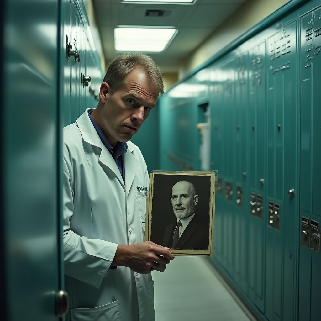 Врач среднего возраста, Александр, стоял у запертого металлического шкафчика в служебной комнате. Высокий, с усталыми зелёными глазами, он был одет в поношенный, складчатый медицинский халат, который уже давно потерял свой белоснежный цвет. Его осанка, слегка согнутая от усталости, говорила о долгих сутках без отдыха. Руки нервно сжимали старую фотографию — найденную случайно среди медицинских старых бумаг. Тонкие морщины на лице и бледность кожи отражали бремя невидимых забот и разочарования, которые давили на него последние годы.