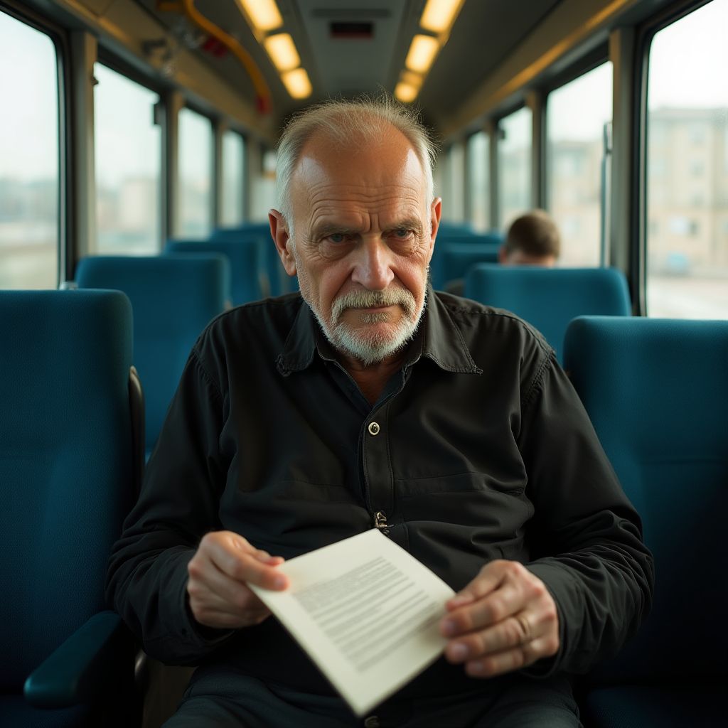Старик закрыл глаза на миг, словно собираясь с последними силами. «Что теперь делать? Отдать письмо или уйти в тень, где никто не сможет найти?» — размышлял он. Его руки дрожали, но воля крепла: «Я оставлю письмо здесь. Пусть найдут. Пусть правда выйдет наружу, даже если это изменит всё.» Он осторожно положил конверт на соседнее сиденье, обвёл взглядом пассажиров, и в его глазах заблестел смешанный свет надежды и прощания.
