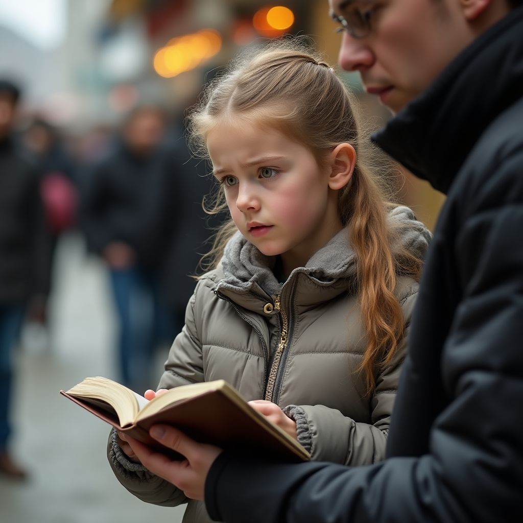 Сердце девочки ёкнуло, когда вдруг при толчке среди толпы дневник выскользнул из рук и рухнул на пыльный асфальт. Она остановилась, застыла в нерешительности, губы почти сжались от волнения. Дневник медленно катился между ног прохожих, его страницы открывались и закрывались, пока один мужчина с усталым взглядом и мягкой улыбкой не наклонился, чтобы поднять его. Девочка молча наблюдала, чувствуя, как дыхание перехватывает тревога: «Что теперь?» — мелькнуло в её голове.