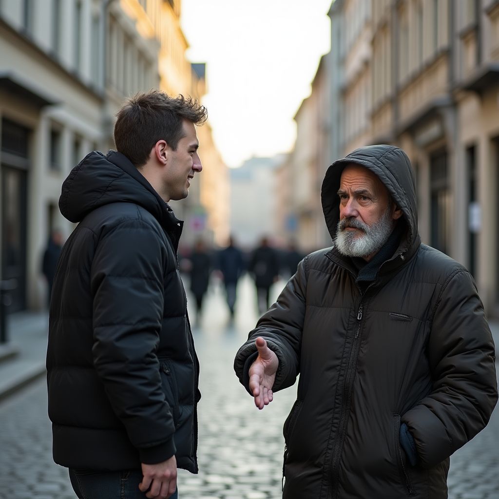 Максим чувствовал, как его взгляд меняется — вместо жалости возникло стремление стать частью решения. Он начал понимать, что бездомный вовсе не хочет жалости, а жаждет справедливости и осознания своей ценности. Люди в толпе начали шёпотом обсуждать услышанное. — «Нужно помочь,» — сказала одна девушка, — «Мы не можем позволить такому человеку страдать в нашем городе.» — «Судьба жестока, но мы можем изменить её,» — добавил пожилой мужчина. В воздухе витала святость перемен, и Максим решительно встал с места.