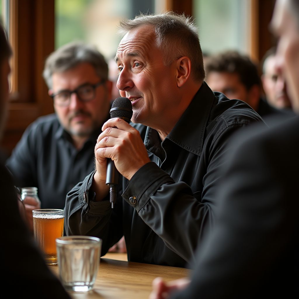 В центре этой тихой картины сидел Виктор — мужчина около пятидесяти с усталым взглядом и растрёпанными тёмными волосами, слегка поседевшими на висках. Его одежда, хоть и была чистой, выдаёт простоту и скромность: старый свитер, потёртые джинсы, обыкновенные ботинки без намёка на бренд. Глубокие морщины вокруг глаз и грустные глаза отражали годы тяжёлой жизни. Виктор медленно потягивал пиво, время от времени поглядывая на микрофон с лёгкой дрожью в руках. Его осанка была немного сутулая, словно вес невидимых забот сдавливал плечи. Для других гостей он казался просто очередным посетителем, приехавшим отдохнуть после долгого дня, но внутри него зрела буря.