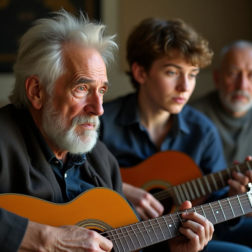 Сердце музыканта ухнуло от боли, но одновременно внутри заиграла слабая надежда. Он слышал, как его песня оживает в голосах новой семьи — возможно, именно это и есть восстановление справедливости. В его руках затрепетали ноты, а губы невольно дрогнули, пытаясь сдержать слёзы.