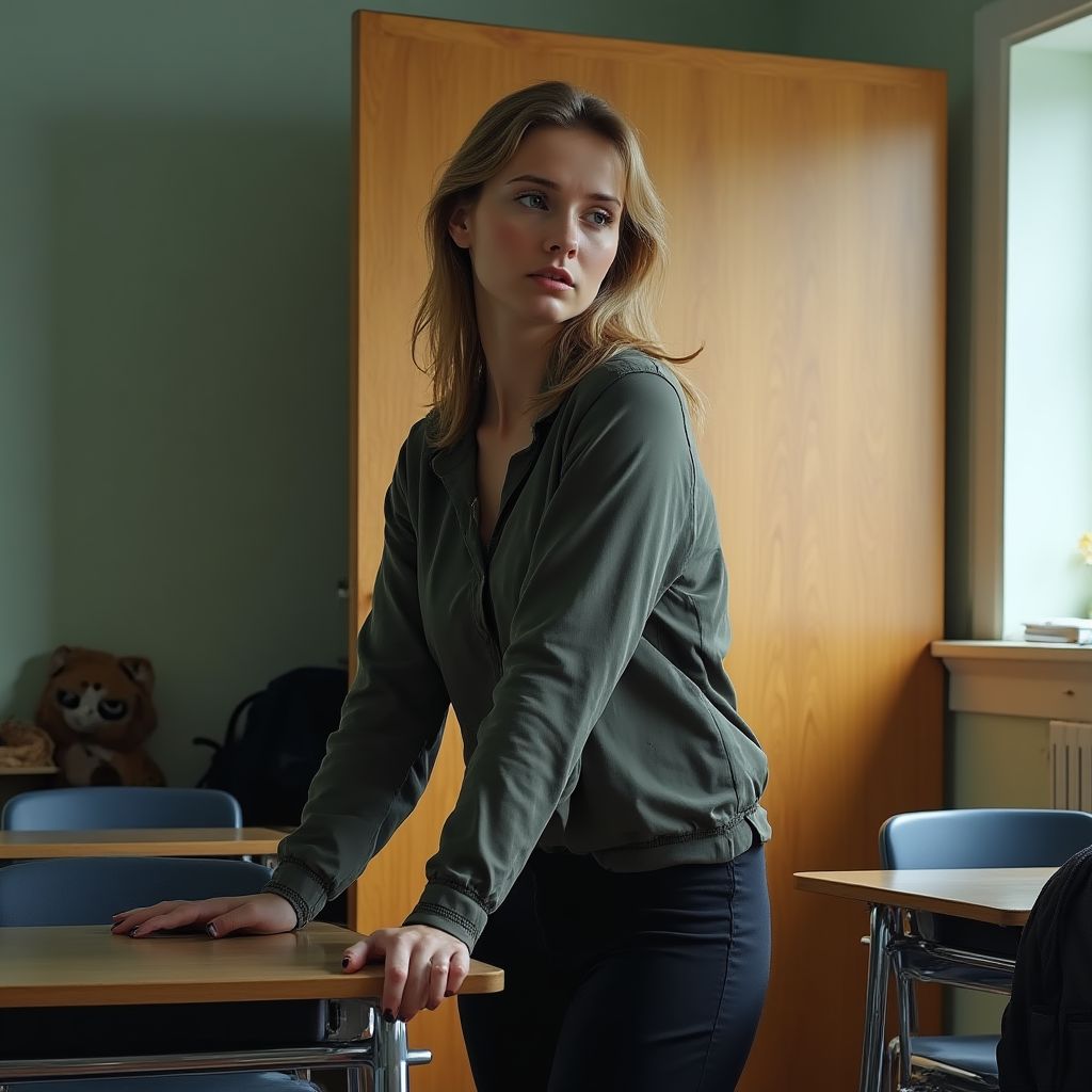 Елена Петровна, учительница биологии средней школы №17, стояла у закрытой двери своего кабинета. Её стройная фигура в скромном, но аккуратном платье была немного напряжена: большие карие глаза внимательно осматривали пустой коридор, а руки сжимали край сумки. На лице чётко читалась усталость, накопившаяся после нескольких месяцев бесконечных уроков и недосыпа, но также и тревога. Её волосы были собраны в тугой узел, подчёркивающий официальность образа, а туфли на низком каблуке тихо касались пола, словно не желая нарушать неподвижность утреннего пространства.
