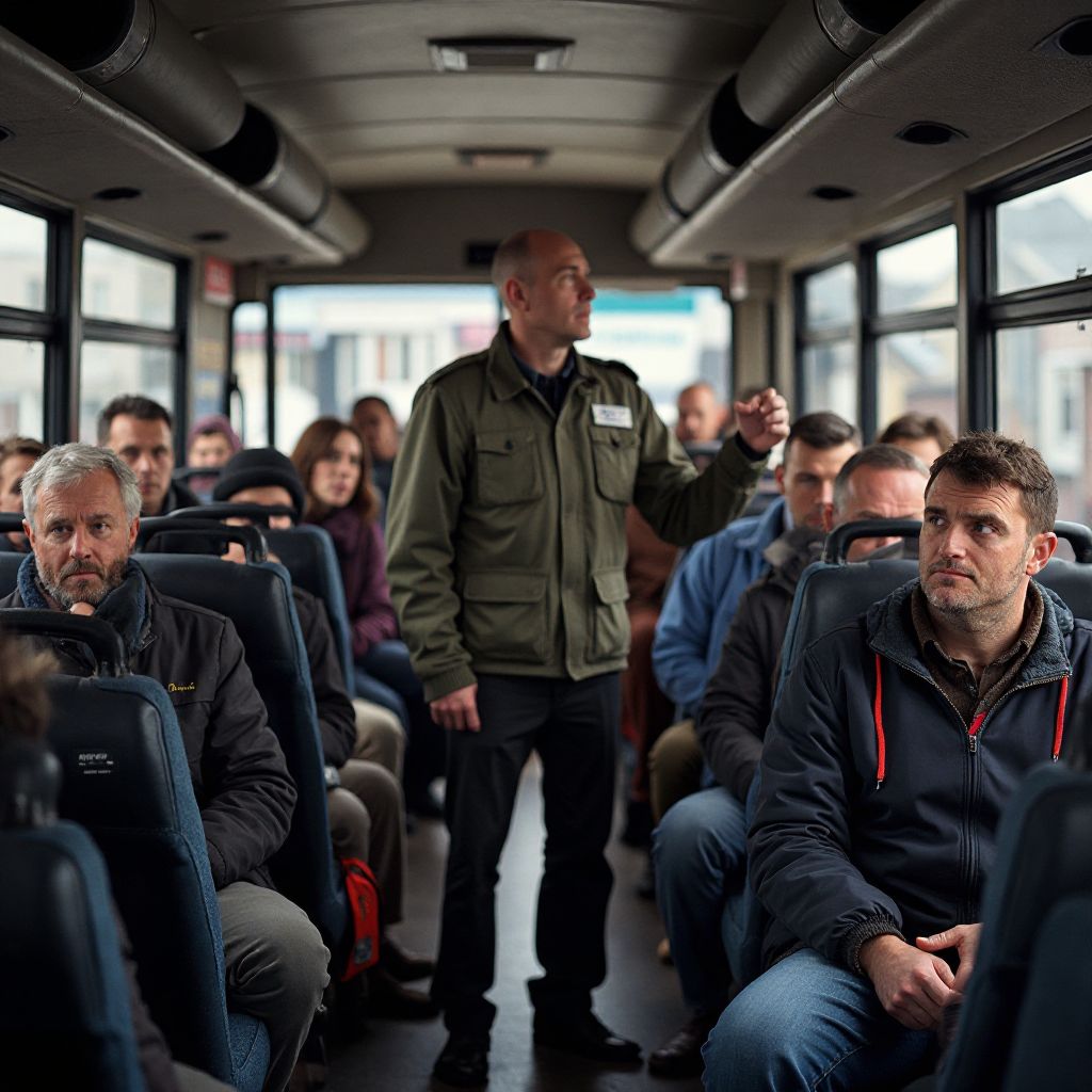 Тишина в автобусе повисла словно свинцовое покрывало, разрезаемое лишь тяжёлыми вдохами и лёгким дрожанием рук водителя. Его глаза метались от одного лица к другому — беременная женщина с горячими, но испуганными глазами, старик с поседевшими бровями, подросток, стиснувший губы, и бездомный с цепкими взглядами. Вдруг у задней двери автобуса резко захлопнулась тень — это была та самая фигура, что влетела — высокий мужчина в тёмном плаще с нахмуренными бровями. Все пассажиры сжались ближе, ощущая, как напряжение достигает критической точки.