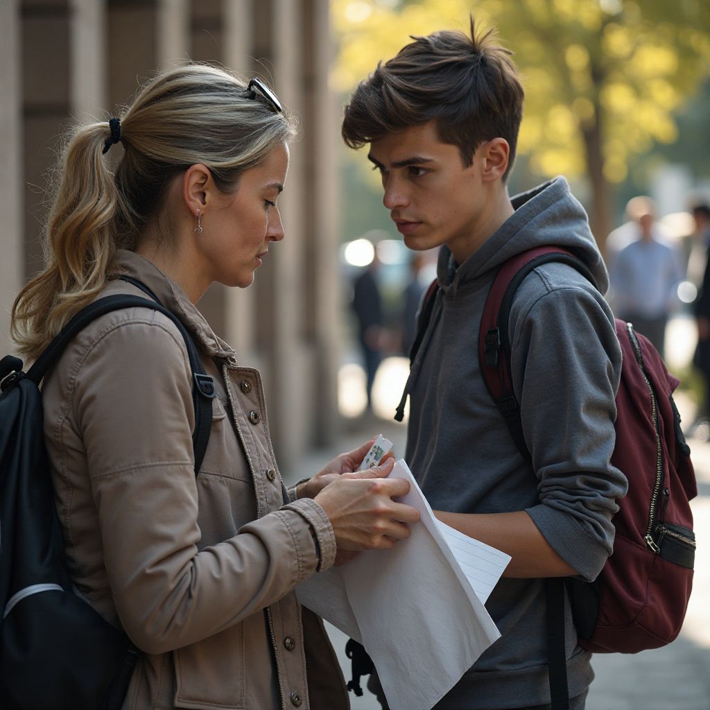 Внезапно возле него подошёл одноклассник, Алексей, молодой парень в модной одежде, который частенько позволял себе насмехаться над Сергеем. «Что там у тебя? Опять чтото из маминой коллекции слёз?» — усмехнулся Алексей, глядя свысока. «Может, наконец перестанешь прятаться за бумажками, а?» — добавил другой школьник, Павел. Сергею стало неловко, и он сжал зубы, пряча рюкзак ближе к телу. «Это не твоя забота», — тихо ответил он, стараясь не показывать, как сильно его задело. Вокруг них начали раздаваться шёпоты и взгляды других учеников, некоторые из которых тихо переговаривались: «Опять этот нищий с запиской мамы», «Он даже открыть её боится».