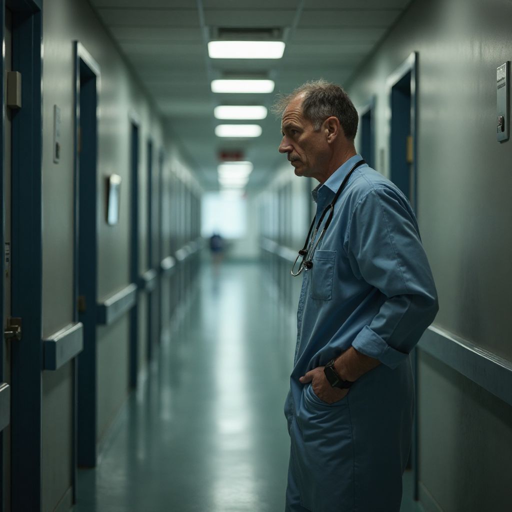 У дверей родильного отделения остановился врач в потертом белом халате — невысокий мужчина с усталым взглядом глубоких карих глаз. Его измождённое лицо отражало долгие ночные смены, на губах застыла тяжёлая усталость, а дрожащие руки выдавали внутреннее напряжение. Врач выглядел чужим среди молодых и красивых женщин, для которых здание формально было местом радости; он же ощущал вес чужой боли и безысходности.