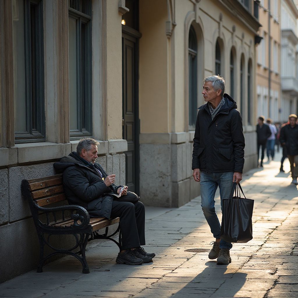 Саша медлил, его дрожащие руки начинали тянуться к пакету, сердце сжималось в груди, словно пыталось вырваться. «Может, это шанс?» — проносилось в голове. Но голос сомнения шептал: «Это ловушка.» Вокруг мелькали подозрительные взгляды, а холод усиливался. Он сделал выбор — принять помощь или отвернуться, отдаться судьбе.