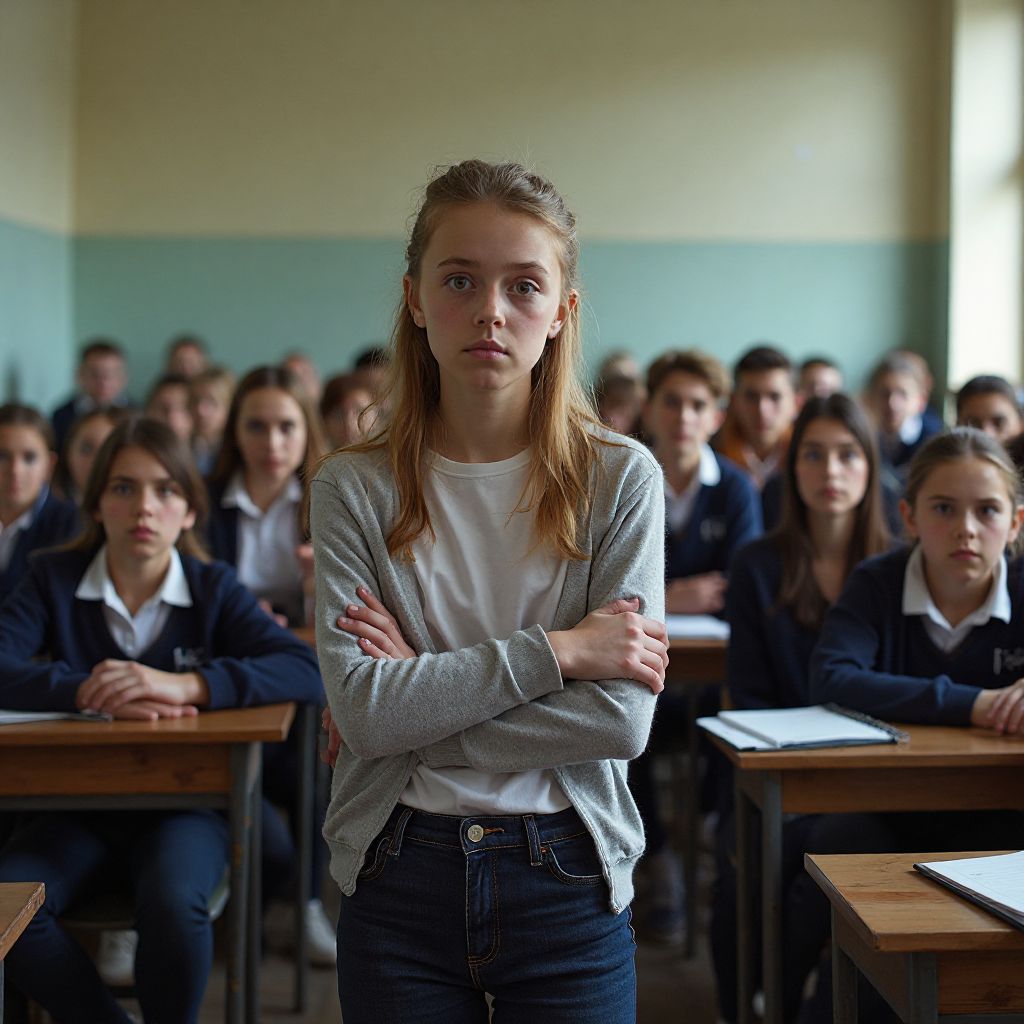 — «Ты не одна,» — прошептала девочка с задней парты, протягивая руку поддержки. — «Мы готовы идти с тобой.» Эти слова развеяли лед отчуждения и наполнили комнату новой, тёплой энергией.