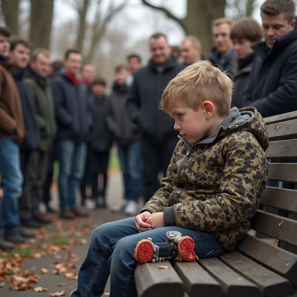 Но возвращаясь не сразу, он заметил, что у скамейки собралась группа взрослых: женщины в потёртых пальто, мужчина с лицом, иссечённым морщинами и болью, и старушка с глубокими глазами и тростью. Всё вокруг казалось напряжённым, воздух — тяжёлым. Они говорили тихо, сбившись в круг, перебрасывая взглядами; в их словах проскальзывало презрение и жалость одновременно. «Это снова детская игрушка?» — с горечью произнёс один из мужчин. «Так они не умеют заботиться», — шептала старушка, стискивая кулаки. Мальчик, стараясь оставаться незаметным, слушал их слова, сердце его сжималось от беспомощности.